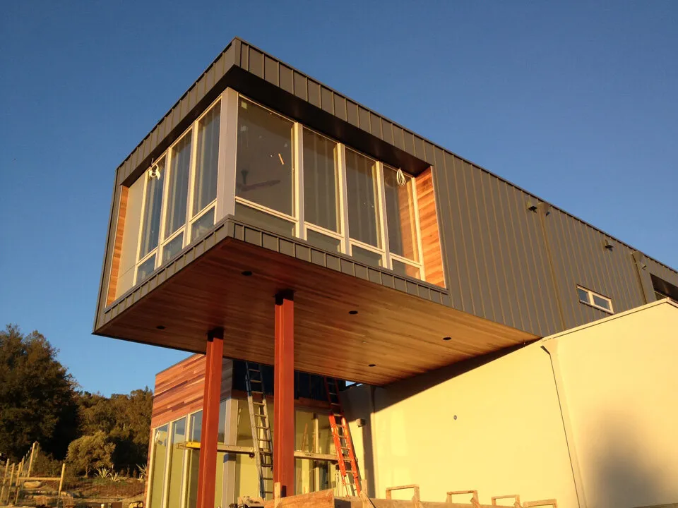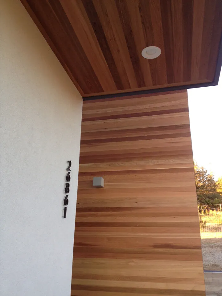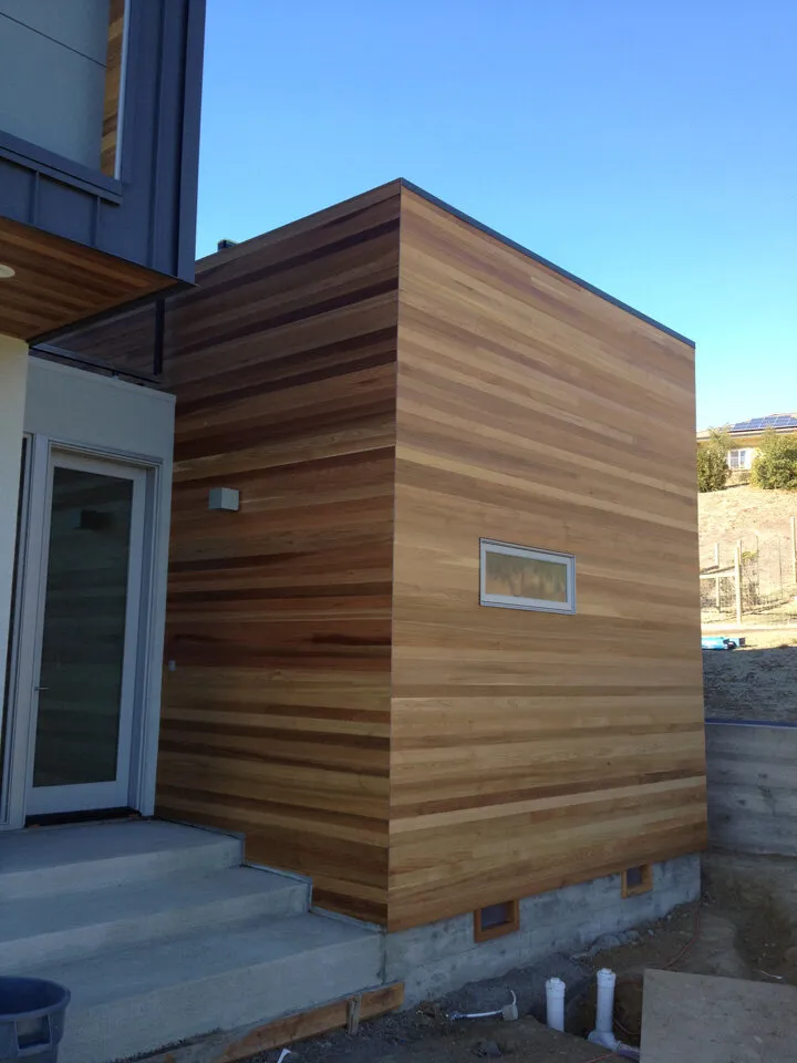 The crew completing the install of the Cedar siding and decking. Other siding materials include standing seam metal accents, hardie board, and stucco.