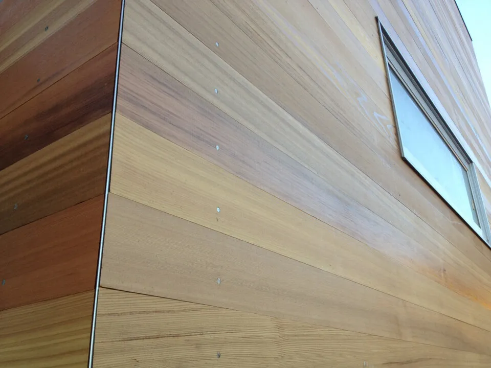 Detail of the tongue and groove Cedar cladding with clear coat.