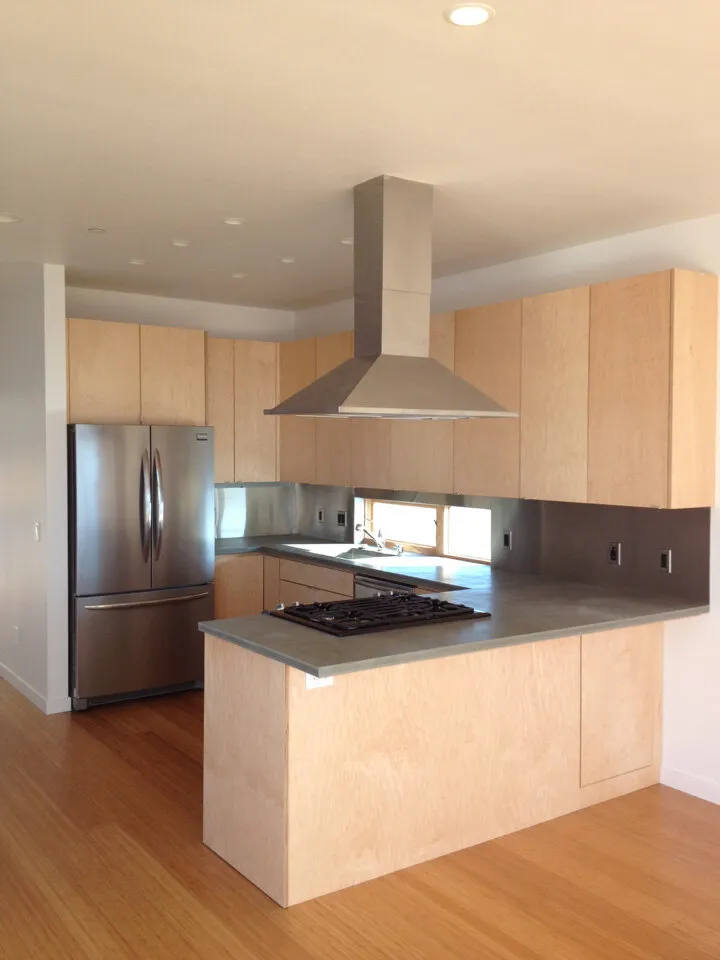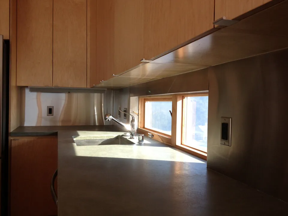 The clean, modern kitchen: recycled Squak Mountain Stone Countertops and custom Maple cabinets by Smith and Vallee.